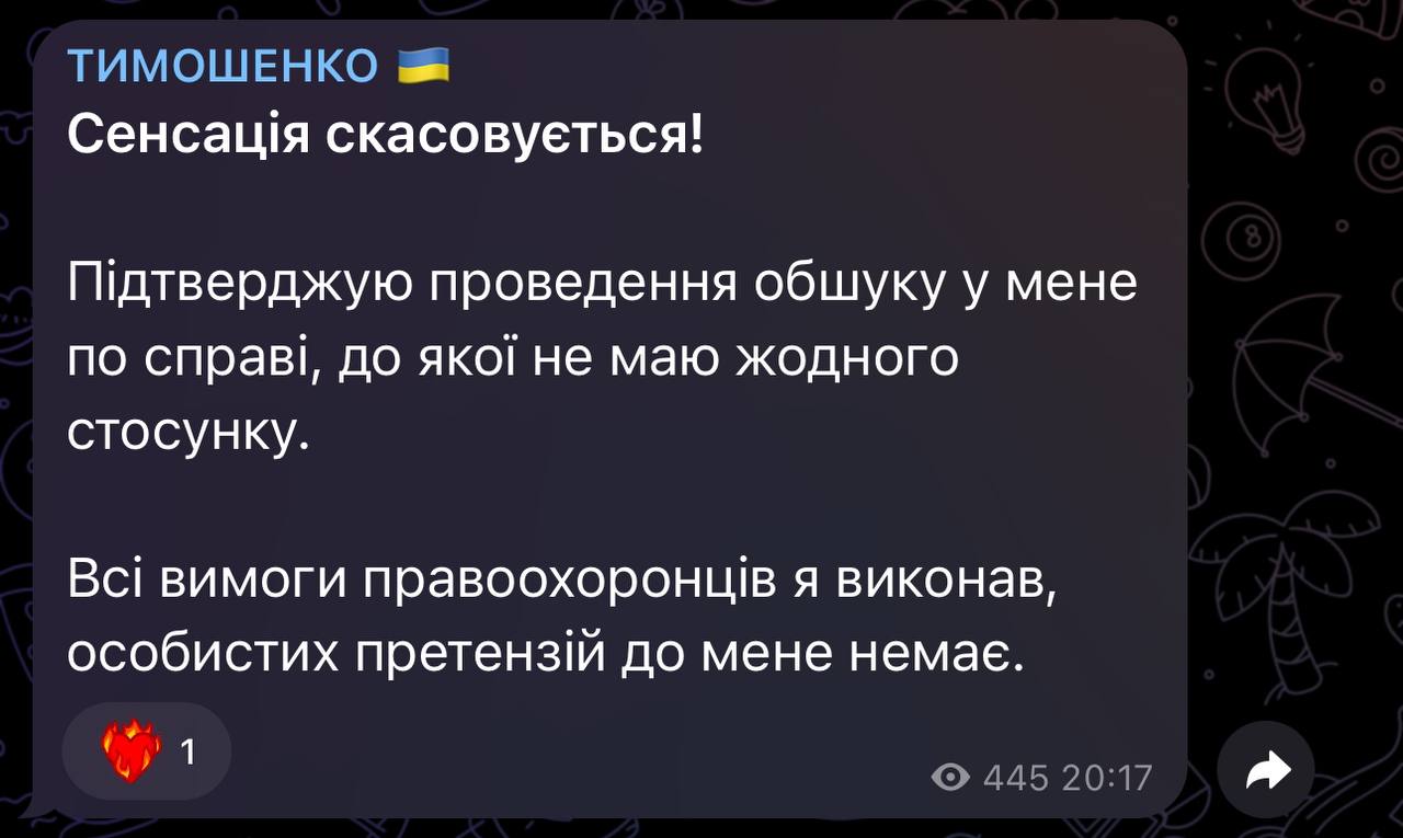 Усі вимоги правоохоронців я виконав, особистих претензій до мене немає, — написав він на своєму ТГ-каналі.