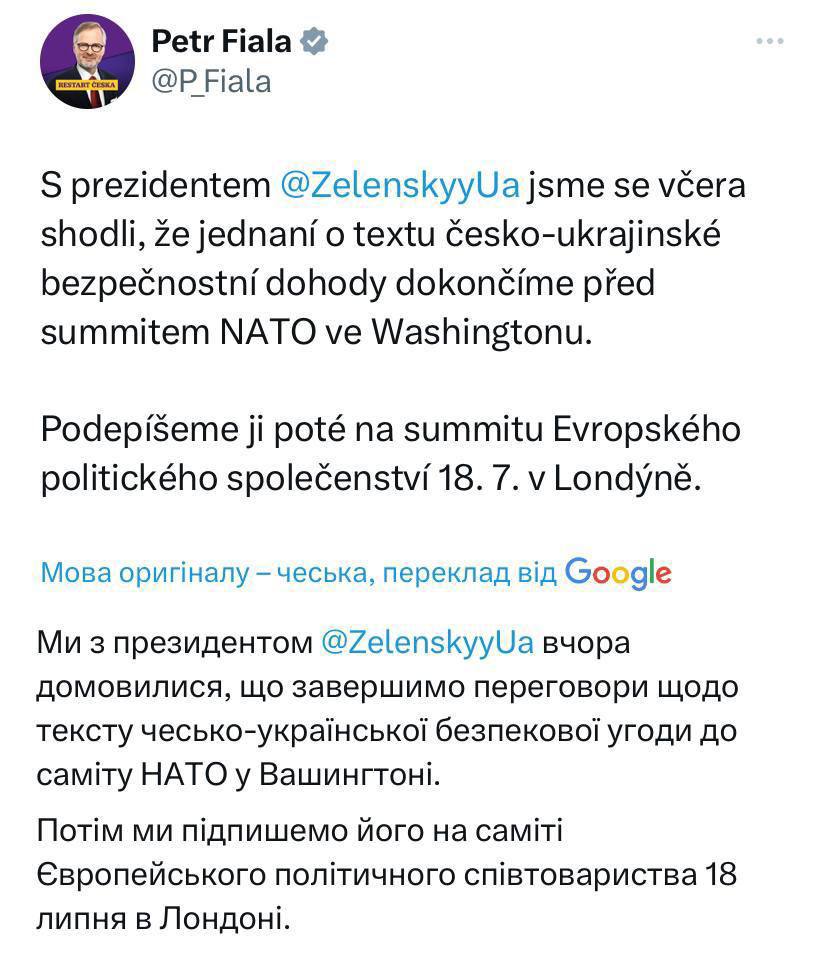 "Із президентом Володимиром Зеленським учора ми домовилися, що завершимо переговори щодо тексту чесько-української угоди про безпеку до саміту НАТО у Вашингтоні. Потім ми підпишемо її на саміті Європейської політичної спільноти в Лондоні 18 липня", - повідомив він.