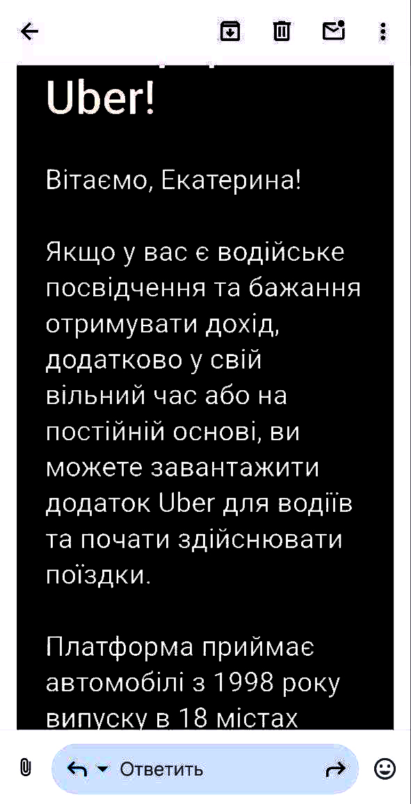 Катерина, яка отримала це повідомлення на пошту, зазначає, що навіть не користується послугами Uber.