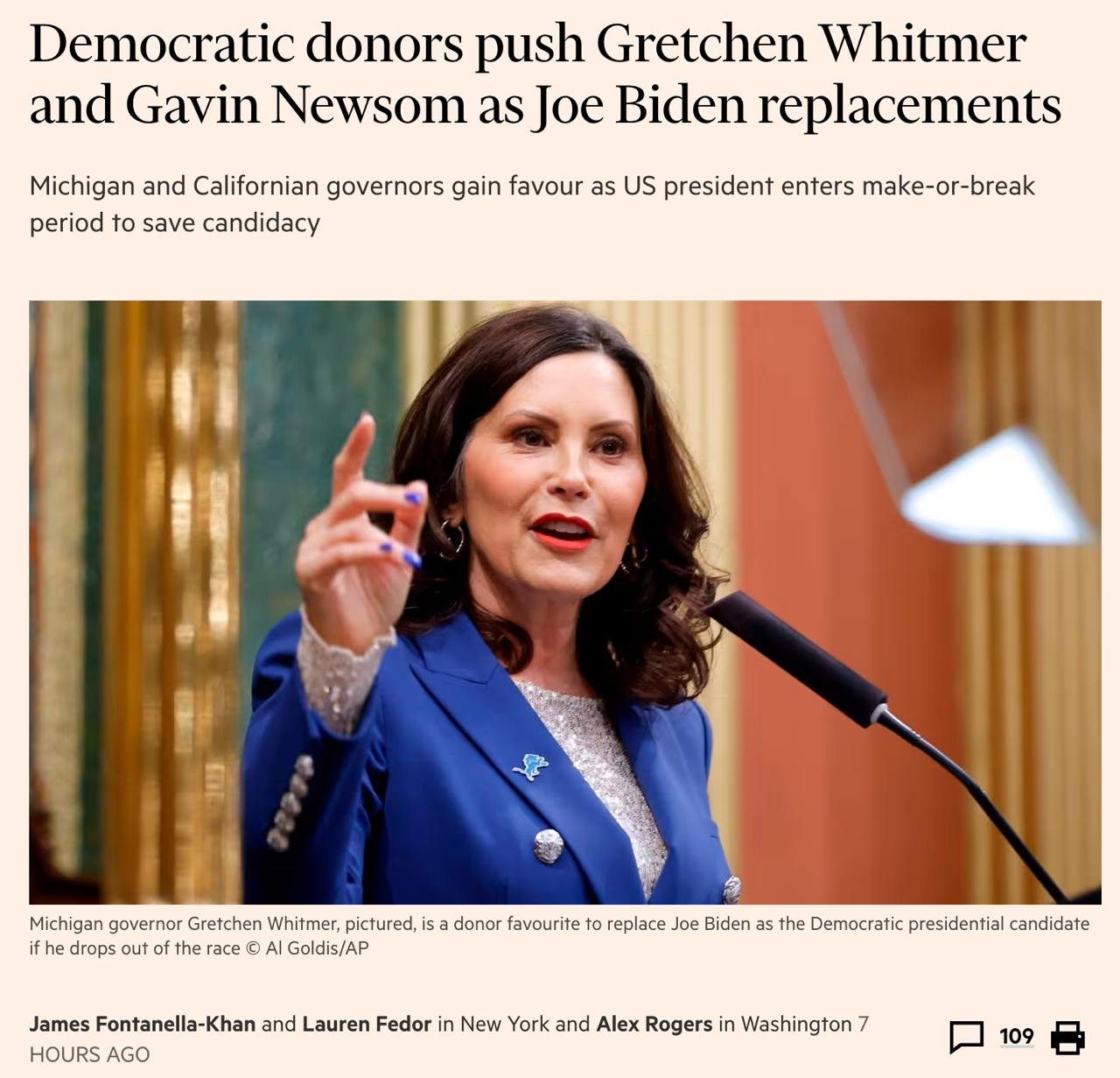 Спонсори висувають кандидатами губернатора Мічигану Гретхен Вітмер та губернатора Каліфорнії Гевіна Ньюсома. Також звучить ім’я Камали Гарріс. Найбільше підтримки у Вітмер.