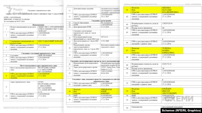 Журналісти «Схем» отримали протокол зборів від листопада 2014 року, на яких ухвалювалося рішення про реєстрацію російського ООО «Санаторий «Коралл» у Криму у «зв’язку з приведенням у відповідність до законодавства Російської Федерації». На ньому є підпис і Наталії Щокіної, і Фаїни Тедеєвої. Віктор Крейдич, як зазначено, був відсутнім.