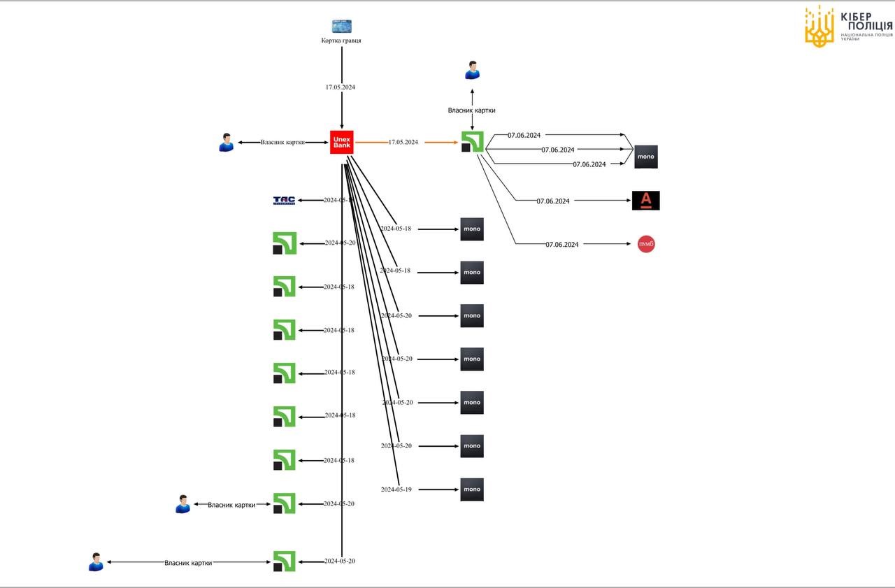 Як конкретно в реальному житті виглядає таке «дерево дропів» – приклад від хлопців з Кіберполіції по одному нелегальному казино. Зверніть увагу, в ній картки 6-ти банків. І це ще дуже проста структура.