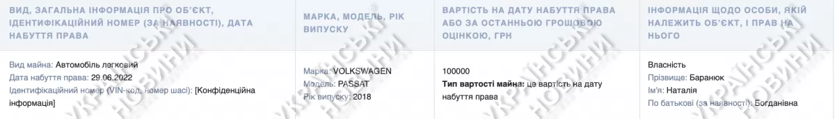 Рік тому, у кінці червня 2022 року, Баранюк купила Volkswagen Passat 2018 року випуску за 100 тис. гривень.