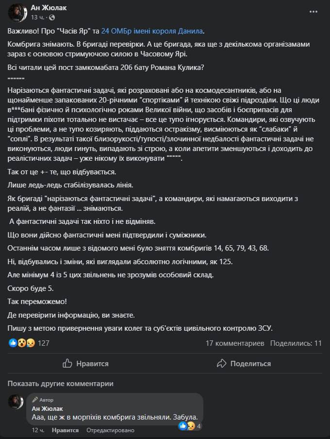 Також вона пише, що останнім часом зняли комбригів 14, 65, 79, 43, 68 бригад.