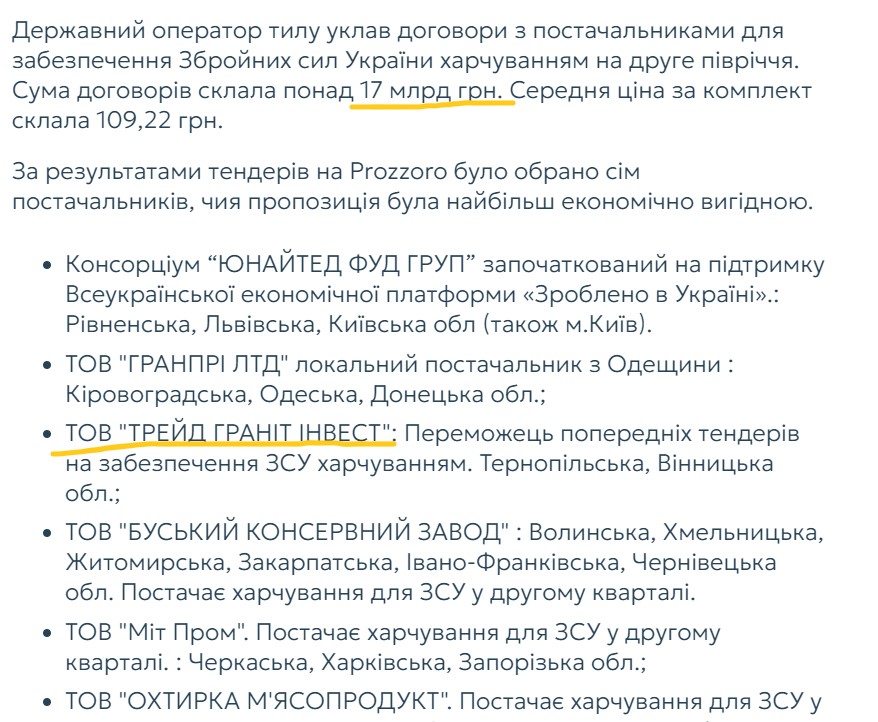 Виявляється – треба. Тому що Дмитро Адамовський зайнявся постачанням продуктів для армії, що воює. Точніше, цим займається фірма, серед бенефіціарів якої вважається Дмитро Адамовський. 10 червня 2024 року Державний оператор тилу повідомив, що уклав контракти на постачання продуктів на загальну суму 17 мільярдів гривень. Серед тих, хто ділитиме ці гроші – ТОВ «Трейд граніт інвест».
