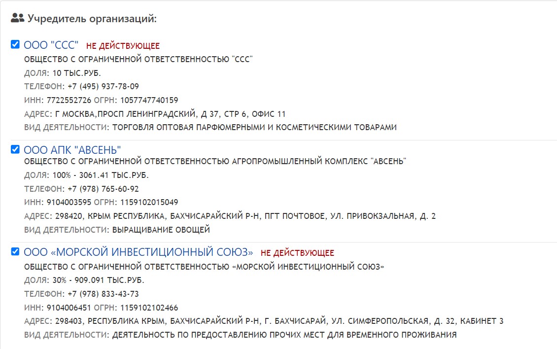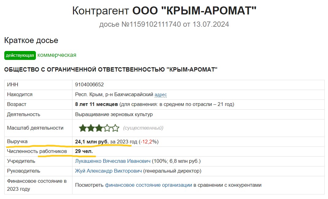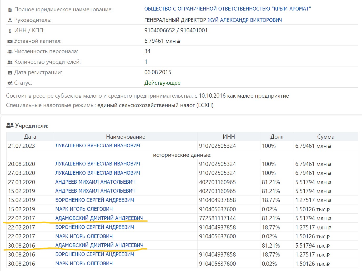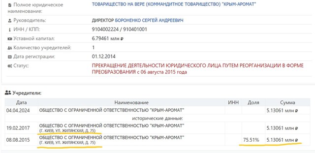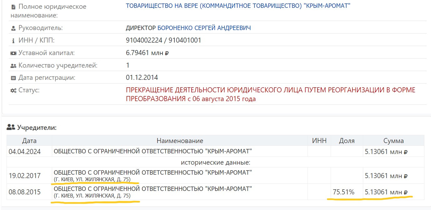 Що цікаво – ТОВ «Крим-Аромат» є правонаступником командитного товариства «Крим-Аромат», зареєстрованого у 2014 році. Зверніть увагу на його засновників: