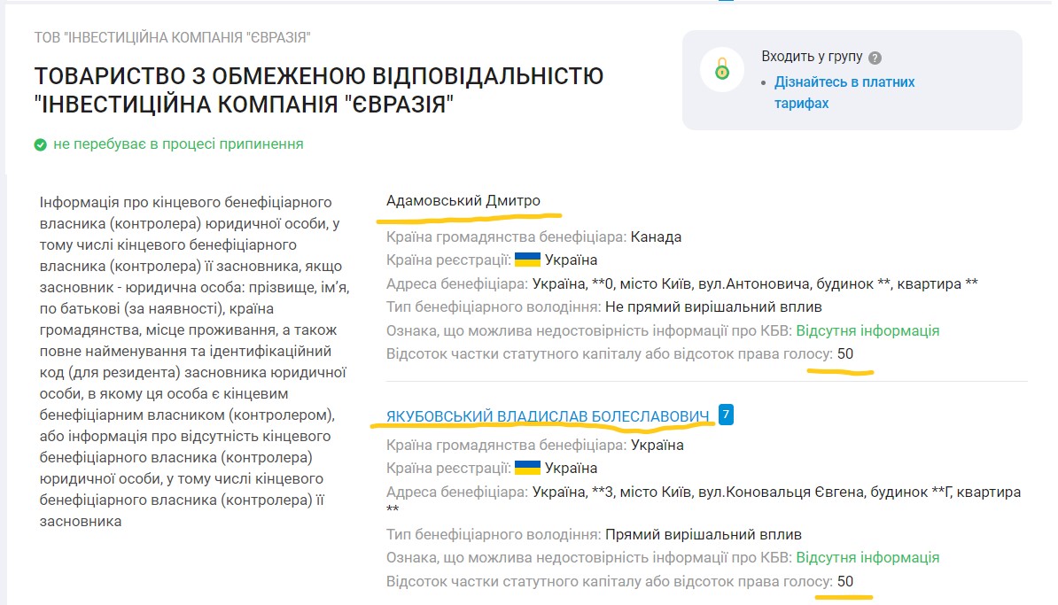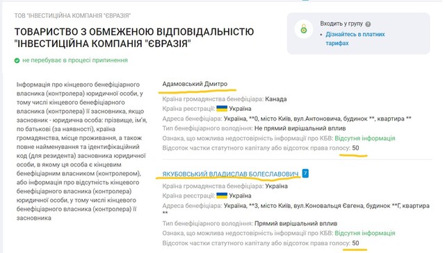 Директор – Владислав Якубовський, який проходив у кримінальній справі щодо «Трейд коммодіті» разом із Андрієм Адамовським. За ТОВ «Інвестиційна компанія Євразія» ховаються той самий Якубовський і Дмитро Адамовський, які володіють фондом у рівних частках: