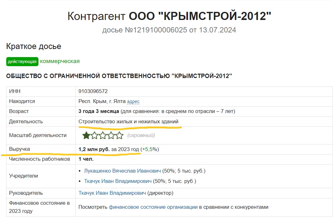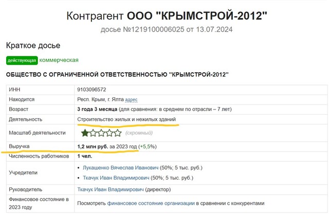 На нього оформлено ТОВ «Кримбуд-2012», яке будує будинки в Ялті. Щоправда, справи у фірми не дуже – вона заробила торік лише 1,2 мільйона рублів.