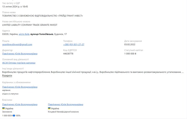 І неважко було здогадатися, що сталося одразу після публікації – у пресі з’явилися матеріали, які чітко показали зв’язок ТОВ «Трейд граніт інвест» із родиною Адамовських. Бенефіціаром є якась Юлія Володимирівна Павличенко: