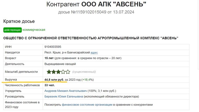 Ще один російський «фунт» Дмитра Адамовського – Михайло Анатолійович Андрєєв, на якого спочатку було переписано частку Адамовського у ТОВ «Крим-Аромат» у 81,21%. Андрєєв є номіналом у ТОВ АПК «Авсень», який торгує овочами в Бахчисарайському районі. Як бачите, справи у фірми йдуть дуже непогано - вона заробила майже 45 мільйонів рублів.