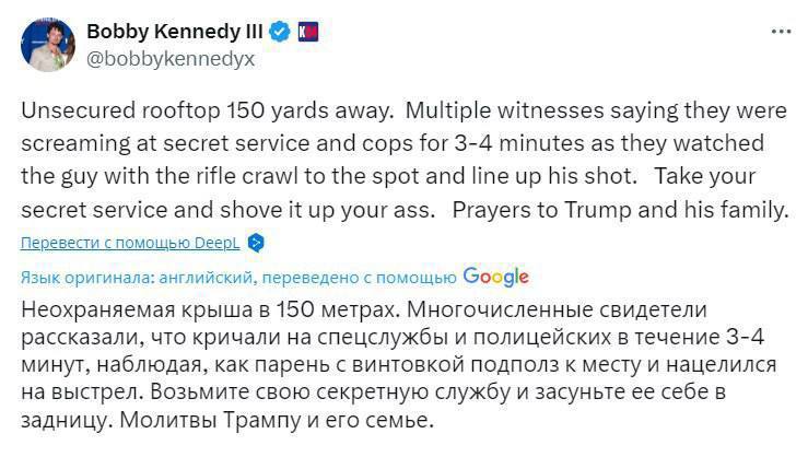 Роберт Френсіс Кеннеді III, син незалежного кандидата у президенти Роберта Кеннеді та онук убитого у 1968 році кандидата у президенти США Роберта Кеннеді, дивується чому спецслужба не виявила заздалегідь стрільця, який знаходився на даху будинку лише за 150 метрів від мітингу.