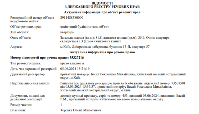 Подібну квартиру без ремонту можна придбати у цьому ЖК за 115 000 доларів. В той же час в ньому продають однокімнатну з ремонтом за 136 000 доларів. В будь-якому випадку квартира, яку записали на матір Ангеліни Терської, коштувала не менше 100 000 доларів. Враховуючи те, що квартира була куплена за 5 днів до розкішного весілля, можна припустити, що це був один з весільних подарунків чоловіка Ангеліни.