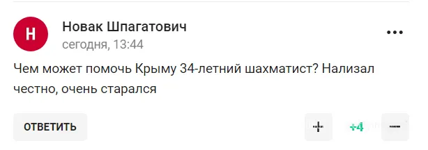 "Мені дуже приємно та хвилююче, бо для мене це буде зовсім інша сфера діяльності. І водночас це шанс бути корисним кримчанам і принести користь рідному регіону. Це велика честь для мене, а й величезна відповідальність. І можливість проявити себе у новій галузі роботи", – сказав 34-річний гросмейстер в інтерв’ю російським пропагандистам.