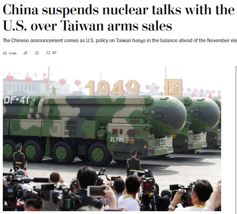 Washington Post пише, що Китай оголосив про призупинення переговорів із США щодо контролю над озброєннями та нерозповсюдження ядерної зброї, звинувативши Вашингтон у продажу американської зброї Тайваню.