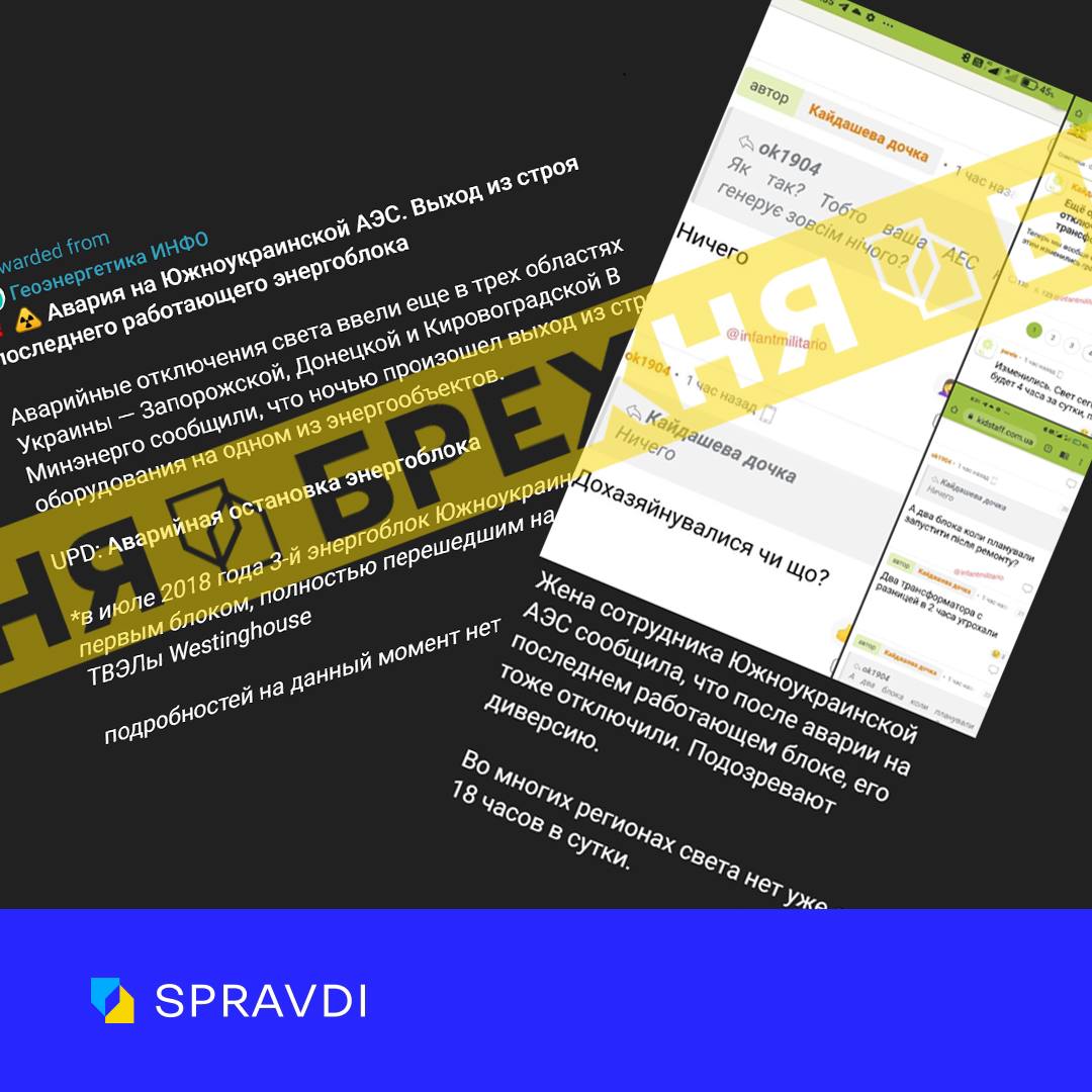 Центр Spravdi із посиланням на «Енергоатом» заявляє, що інформація про аварію на Південноукраїнській АЕС не відповідає дійсності.