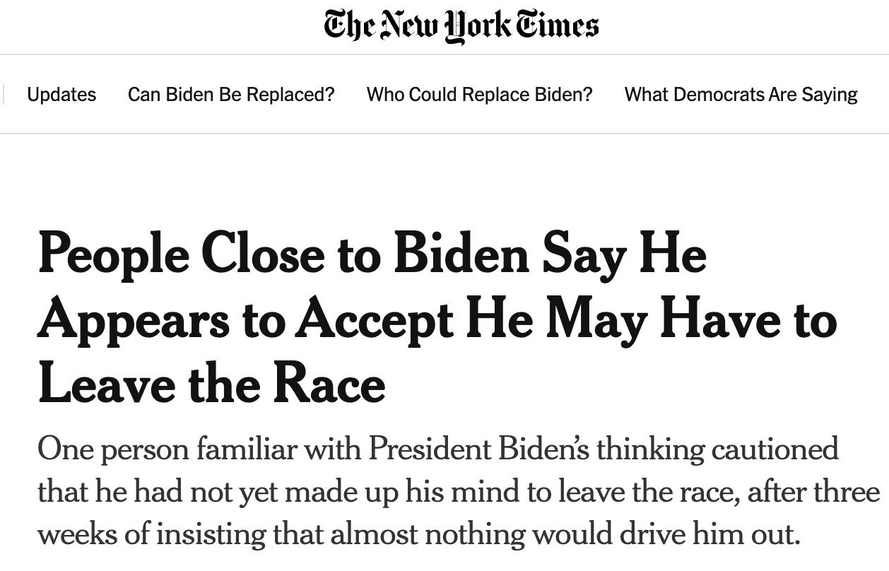 The New York Times, із посиланням на близьких до президента людей, пише, що Байден починає схилятися до виходу з передвиборчих перегонів.