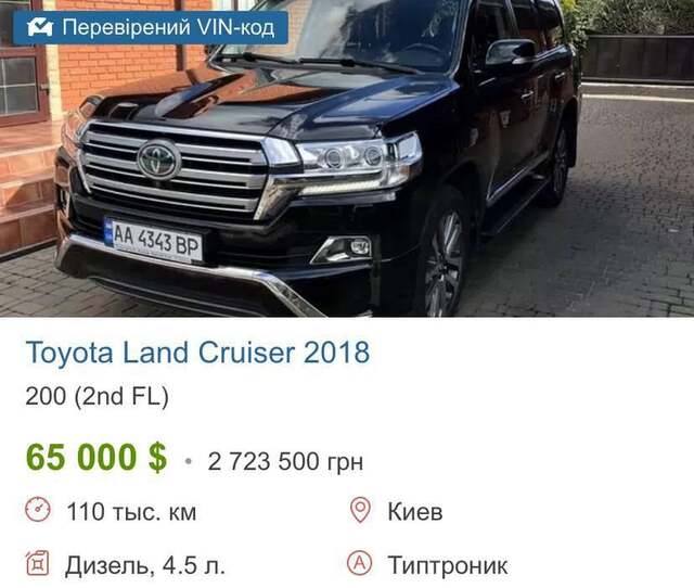 Не увійшов у декларацію автомобіль Toyota LC 200 вартістю 65 000 тис доларів, яким користується подружжя.