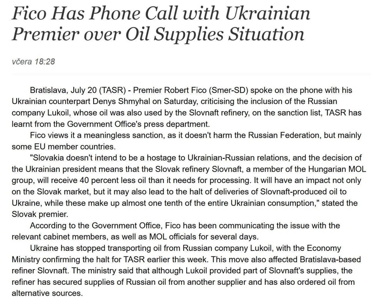 "Словаччина не має наміру бути заручником українсько-російських відносин, а рішення українського президента означає, що словацький нафтопереробний завод Slovnaft, що входить в угорську групу MOL, отримає на 40% менше нафти, ніж йому потрібно для переробки", – заявив словацький прем’єр.