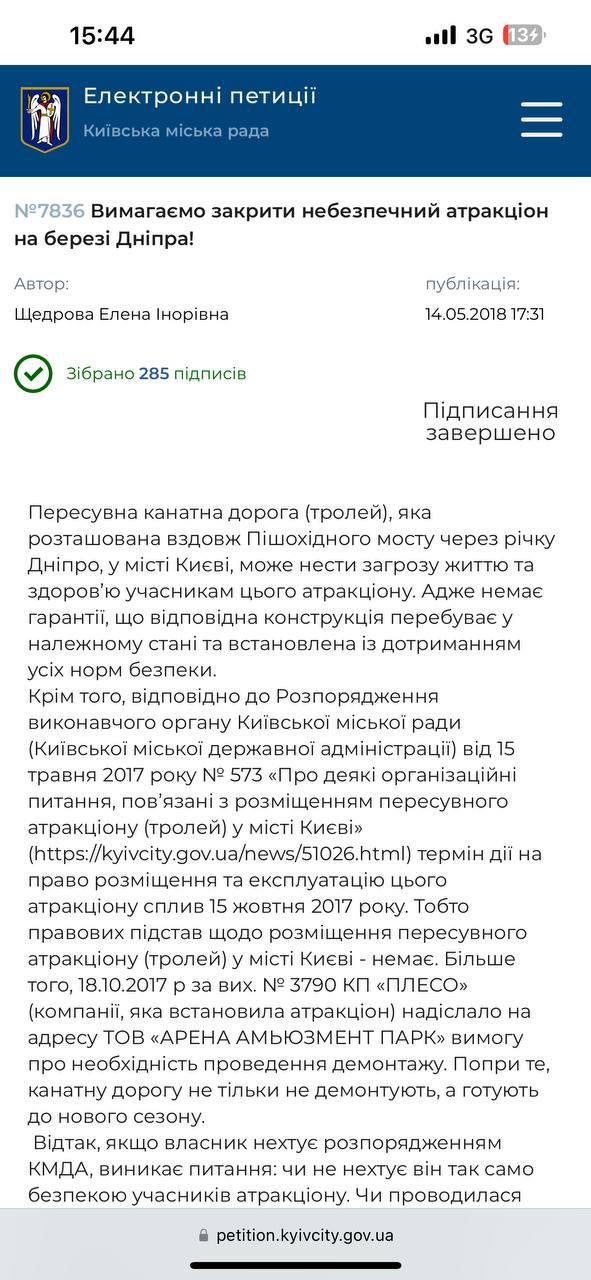 На сайті КМДА була петиція у 2018 році про заборону тролеїв через Дніпро через загрозу життю учасників атракціону.