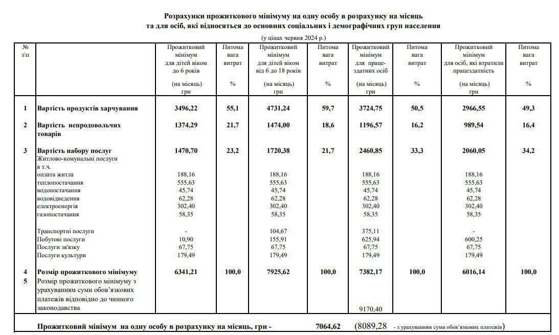 Міністерство соціальної політики надало інформацію щодо фактичного розміру прожиткового мінімуму на одну особу, а також для тих, хто відноситься до основних соціальних і демографічних груп населення, у цінах червня 2024 року, розрахованого відповідно до статті 5 Закону України „Про прожитковий мінімум”.