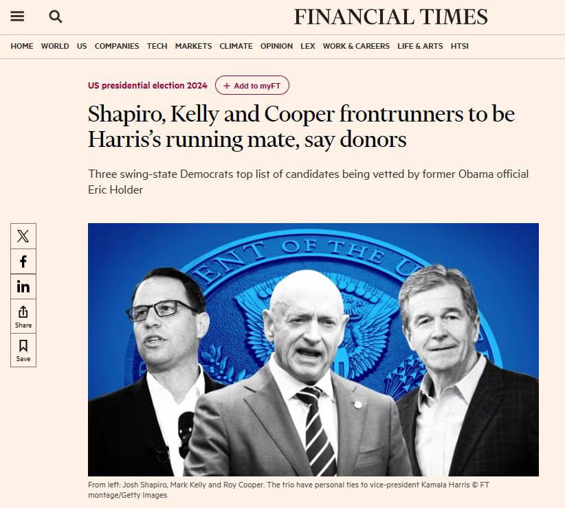 Голлівудські спонсори, за даними джерел газети, віддають перевагу колишньому астронавту Марку Келлі, а донори з Уолл-стріт – губернатору Пенсільванії Джошу Шапіро та губернатору Північної Кароліни Рою Куперу.