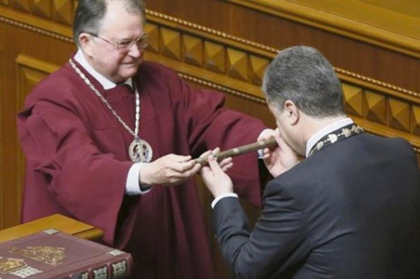Петро Порошенко з вдячністю прийняв символ влади з рук Юрія Бауліна, чий син відмітився на рейдерському ринку нерухомості.