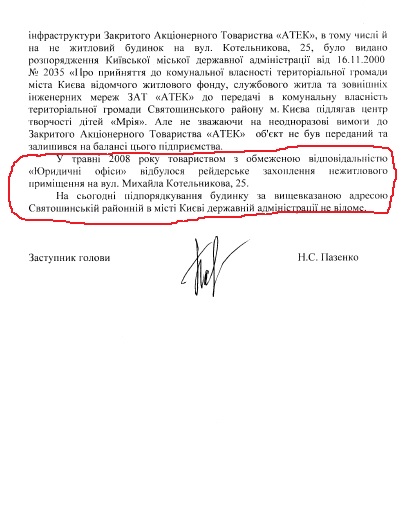 «У травні 2008 року товариством з обмеженою відповідальністю «Юридичні офіси»відбулося рейдерське захоплення нежитлового приміщення на вул.Михайла Котельникова,25».