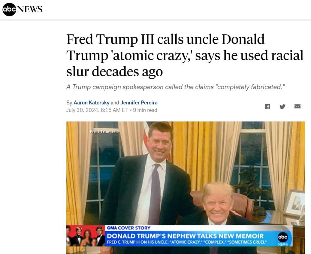 Племінник колишнього президента Дональда Трампа, Фред Трамп III, заявив, що його дядько "атомний божевільний", що він був свідком того, як він використав расові образи кілька десятиліть тому, і що він планує голосувати за Камалу Гарріс.