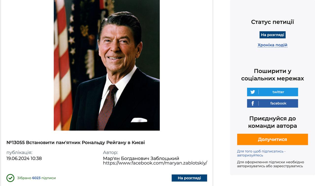Електронна петиція про встановлення пам’ятника 40 президенту США Рональду Рейгану в Києві набрала необхідні 6 тис. голосів і передана на розгляд влади.