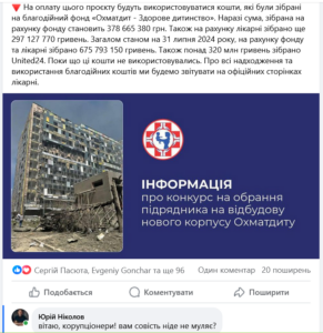 В «Охматдиті» акцентували увагу, що «проведений конкурсний відбір не є тендером в розумінні Закону України «Про публічні закупівлі», а є приватним конкурсом, організованим з метою відкритого та добросовісного використання коштів, пожертвуваних громадянами».