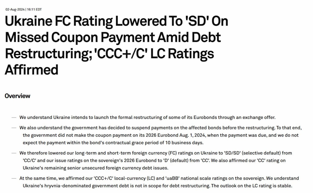 Україна 1 серпня мала виплатити доходи за єврооблігаціями, але цього не сталося, тому "ми знизили наші довгострокові та короткострокові рейтинги в іноземній валюті України до SD/SD". "Ми також знизили рейтинг єврооблігацій 2026 з CC до D (дефолт)", – йдеться в заяві агентства.