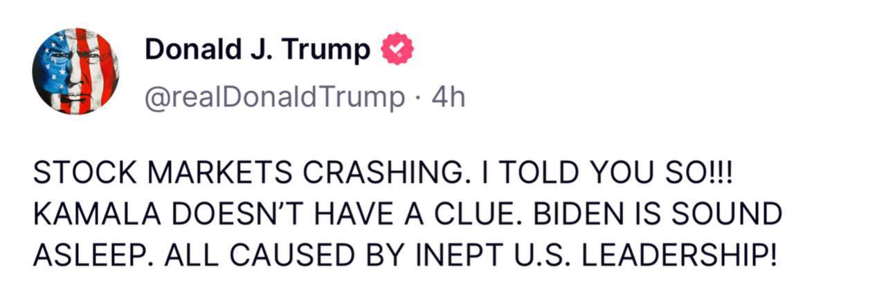 «На фондових ринках обвал. А я вам казав! Камала нічого не розуміє. Байден міцно спить. У всьому винне некомпетентне керівництво США».