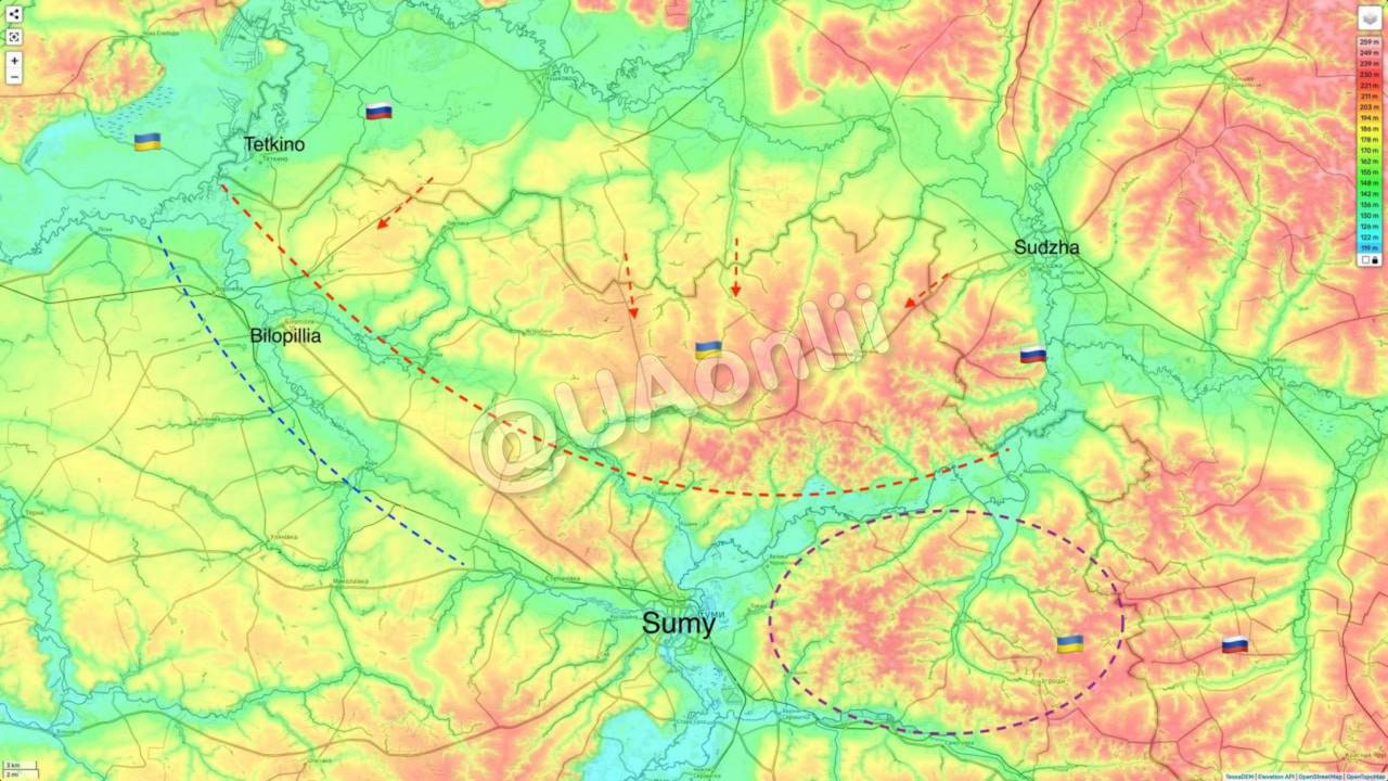 - Суджа розташована в низині, а українські війська наступають з височини, що дає їм вогневий контроль над логістичними шляхами.