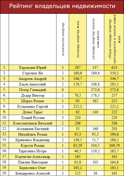 Как видим, в этом списке абсолютным лидером является небезызвестный экс-нардеп Юрий Кармазин, который сам является обладателем трех квартир общей площадью 287 кв. м., а еще 337 кв. м. принадлежат членам его семьи.