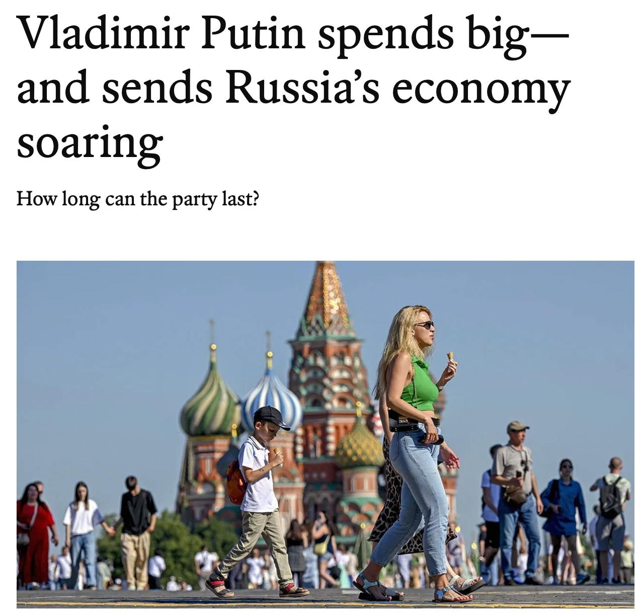"Економіка прискорюється. Безробіття близьке до рекордно низького рівня, у рубля все добре. Щоправда, інфляція занадто висока - у червні ціни зросли на 8,6% у річному обчисленні, що значно вище за цільовий показник центрального банку в 4%, але зі зростанням грошових доходів на 14% у річному обчисленні купівельна спроможність росіян швидко зростає", - ідеться в статті.