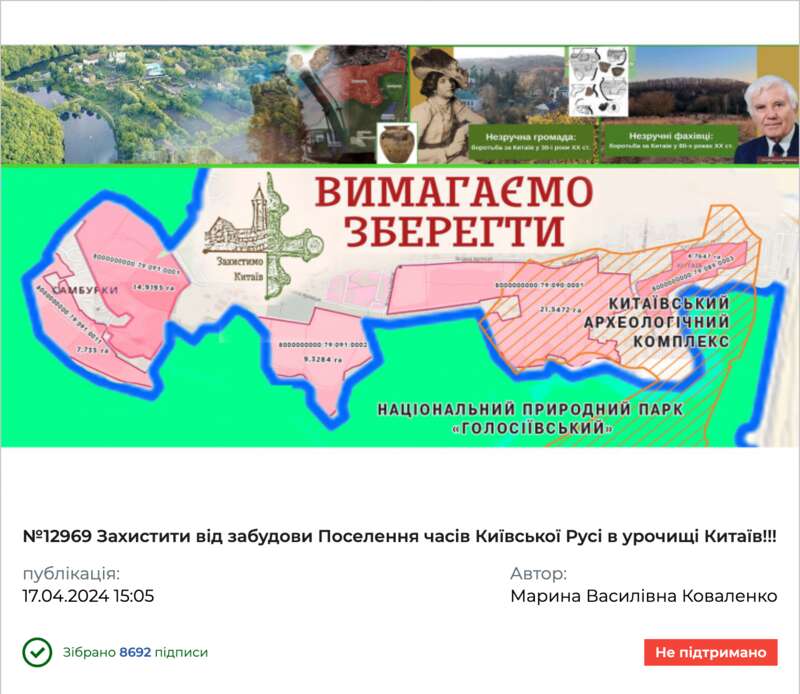 Заповідний Китаїв знову опинився у фокусі громадського обговорення навесні 2024 року. Тоді з’явилась петиція із комплексною вимогою стосовно земельних ділянок у трьох урочищах, що розташовані поруч — Китаїв, Болгарське та Самбурки. Громадськість вимагала захистити територію Китаївського археологічного комплексу від забудови, припинити договори оренди на зазначені земельні ділянки та повернути їх у державну власність. Менш ніж за місяць петиція зібрала 8692 підписи, проте Київрада її не підтримала.