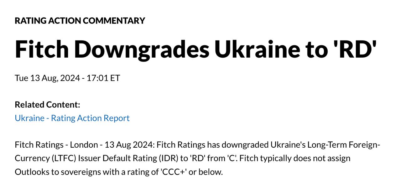 "Зниження рейтингу до рівня "RD" слідує за закінченням 10-денного пільгового періоду для виплати купонного доходу за єврооблігаціями на 750 млн дол, який мав відбутися 1 серпня. Це означає дефолт відповідно до критеріїв Fitch.