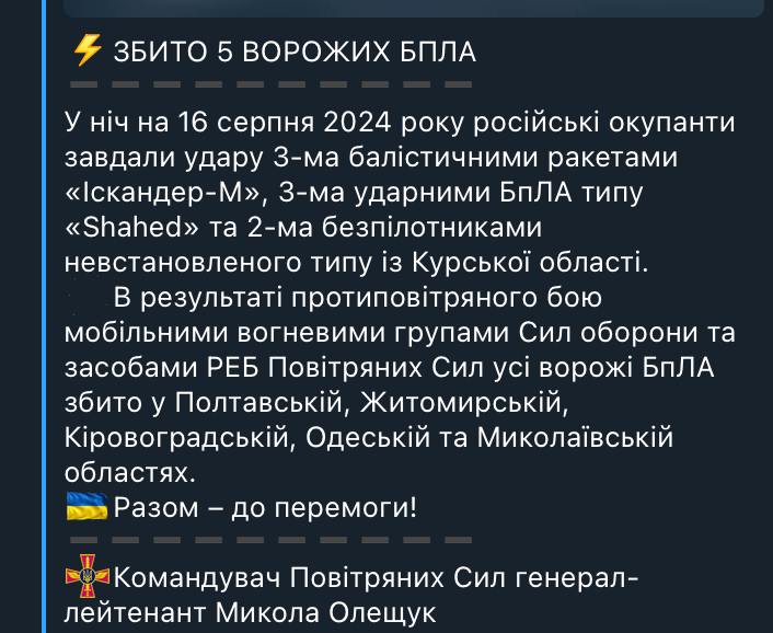 Збройні сили України повідомили, що в ніч проти 16 серпня збили п’ять ударних безпілотників у межах Полтавської, Житомирської, Кіровоградської, Одеської та Миколаївської областей.