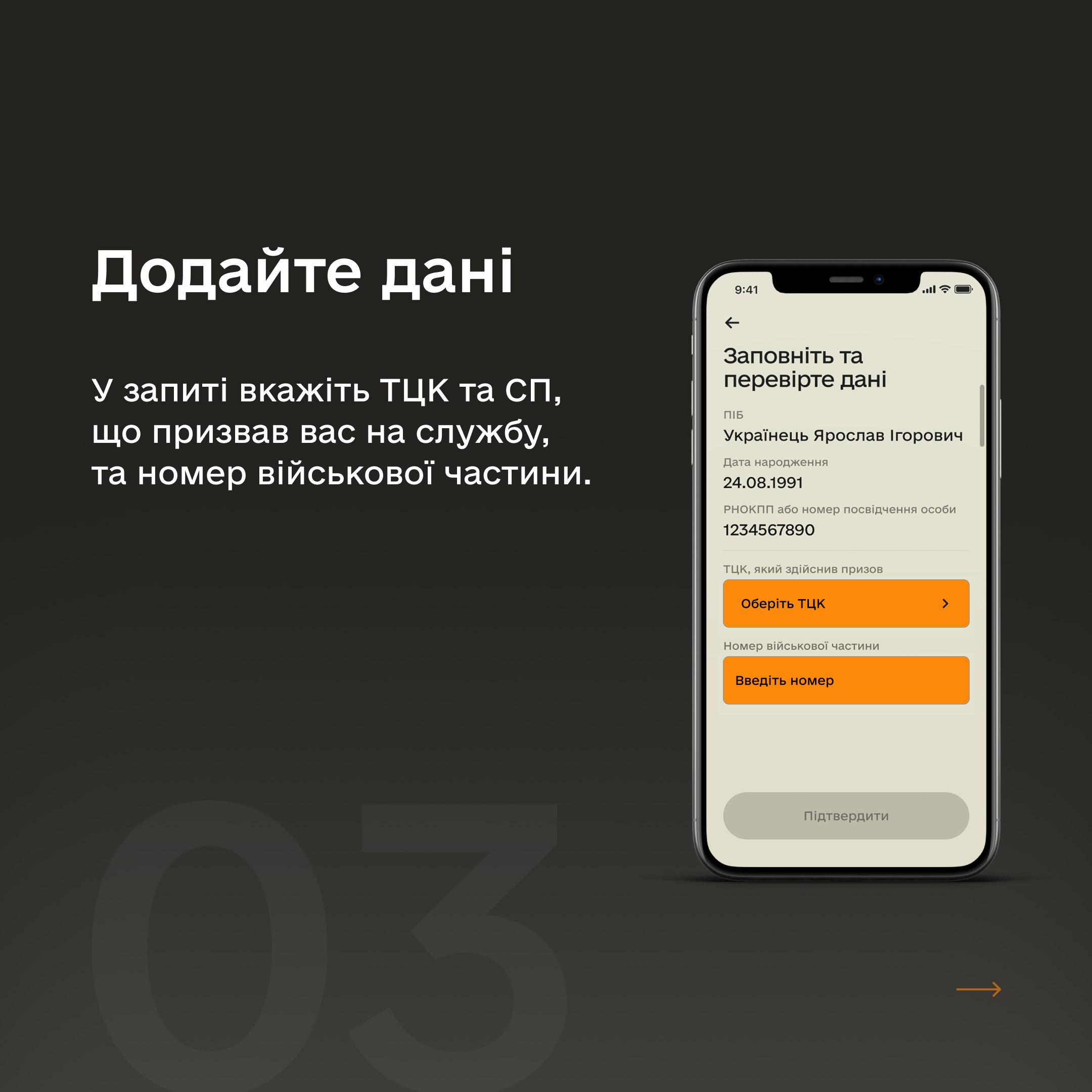 Крок 5. Оновити дані, необхідні для виправлення помилки — обрати ТЦК, який проводив мобілізацію, та вказати номер військової частини.