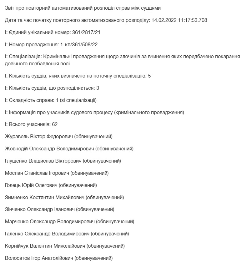 Зокрема, 25 і тричі 30 липня 2024 року було проведено авторозподіл провадження, слухання якого врешті-решт припало на колегію суддів у складі головуючого судді Віталія Анікушина та суддів Наталії Сіренко та Наталії Бражник.