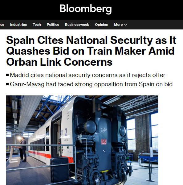 Уряд Іспанії відмовився від пропозиції угорської компанії Ganz-Mavag Europe Zrt про придбання іспанського виробника поїздів Talgo SA, оскільки керівництво цієї компанії пов’язане з прем’єр-міністром Угорщини Віктором Орбаном.