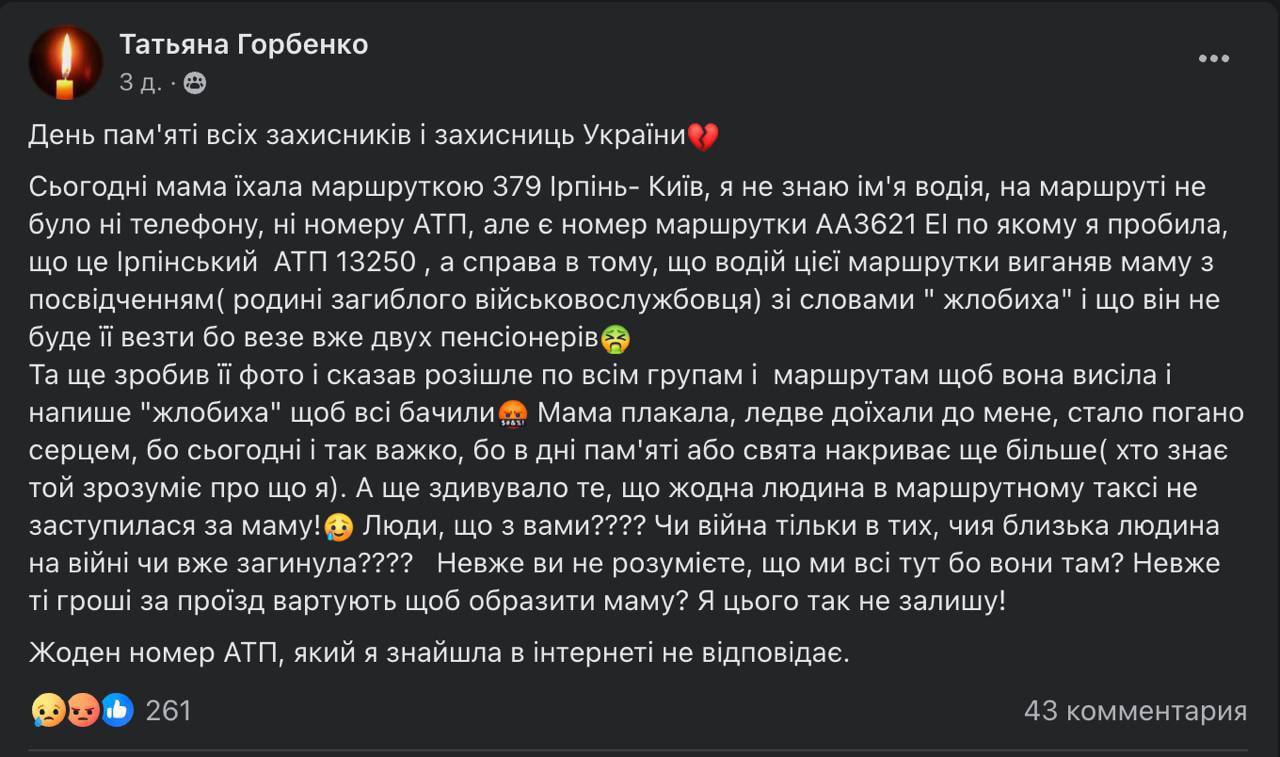 Справа в тому, що водій цієї маршрутки виганяв маму з посвідченням родини загиблого військовослужбовця зі словами «жлобиха». Сказав, що не буде її везти, бо везе вже двох пенсіонерів, — зазначила пані Тетяна.