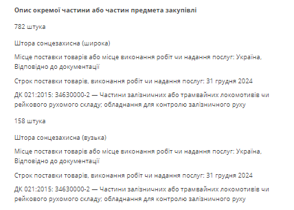 За умовами тендеру передбачено закупівлю сонцезахисних подвійних штор для пасажирських вагонів на загальну суму 8 412 120,00 грн з ПДВ.