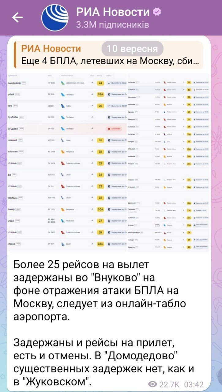 У Росії внаслідок атаки дронів, що відбулася вночі 10 вересня, тимчасово призупинили роботу аеропортів "Внуково" та "Домодєдово" в Москві, а також "Жуковського" в Московській області. Аеропорти не приймають літаки та не відправляють рейси за розкладом.