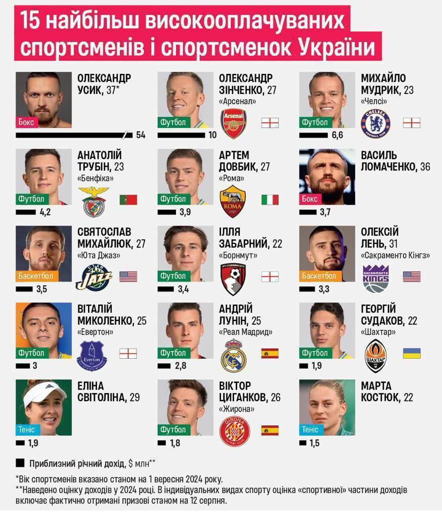 Згідно з даними Forbes, найбільше серед українських спортсменів за рік заробив Олександр Усик - $54 млн. Він 18 травня здолав британця Тайсона Ф’юрі в бою за титул абсолютного чемпіона світу в надважкій вазі.