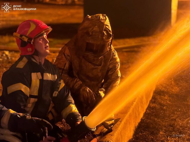 "Івано-Франківська область: рятувальники ліквідували пожежу на промисловому підприємстві, яка виникла внаслідок ворожої атаки. До ліквідації були залучені кількасот надзвичайників та десятки спеціалізованих автомобілів, а також 3 пожежні потяги й пересувний пункт управління.