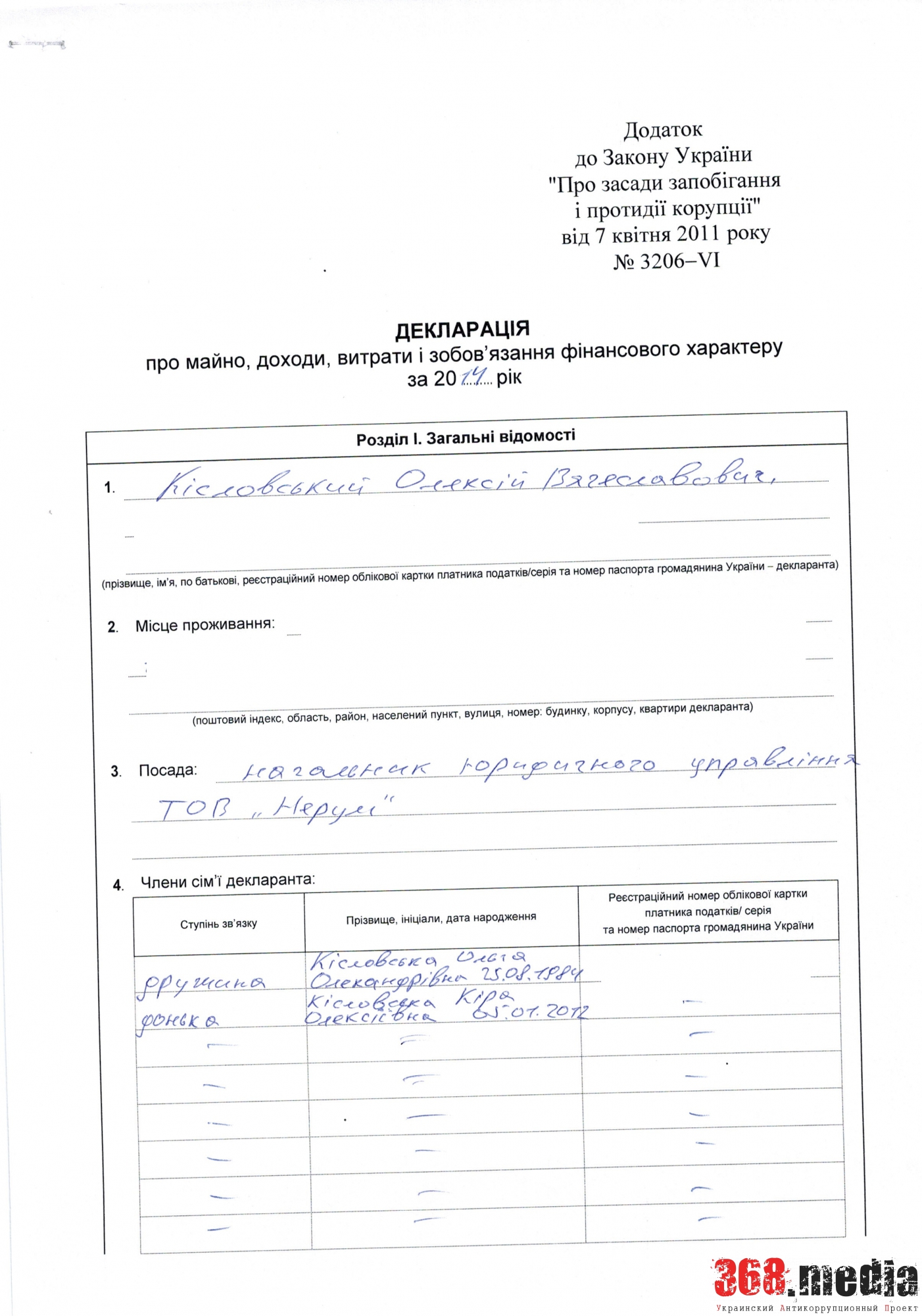Речь идет о «Бердянском дельфинарии «Кобзов», где Алексей Кисловский числится учредителем и руководителем еще с 2009 года. Его взнос в уставной капитал предприятия составляет 63 тыс. гривен. Эти данные в декларации не указаны.