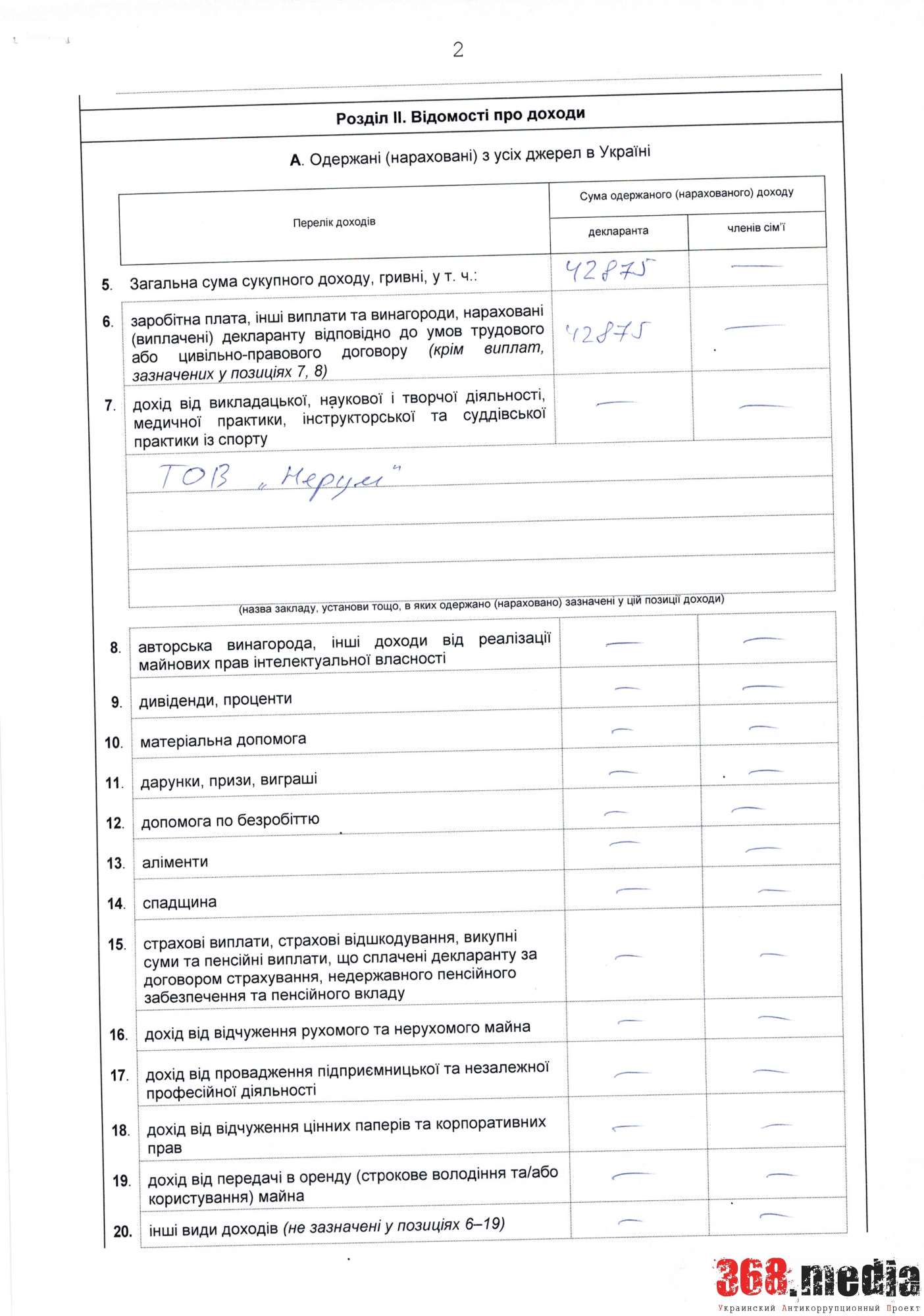 В 2014 году его доход составил 42,8 тыс. гривен. Эти средства он заработал на посту начальника юридического управления ООО «Нерум», где одним из основателей является его брат Андрей. Интересно, что последний является начальником юридического департамента этой же фирмы. Согласистесь, довольно необычно, что в такой фирме есть управление и департамент с одинаковыми функциями.