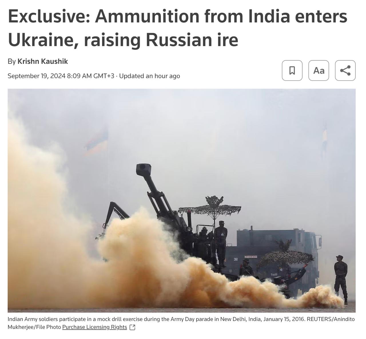 Індійські джерела стверджують, що мова йде про дуже невелику кількість боєприпасів, які надходять в Україну через Італію та Чехію. Делі розглядає конфлікт в Україні як можливість розвитку свого сектору експорту зброї, що започатковується.