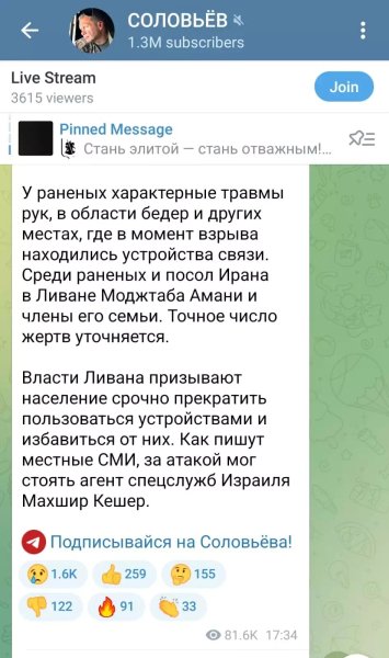 Так, Соловйов стверджував, що за останніми подіями в Лівані стоїть ізраїльський агент розвідки "Моссад" на ім’я Махшир Кешер. За його словами, цей агент нібито зіграв ключову роль в організації атак, які призвели до загибелі бойовиків "Хезболли".